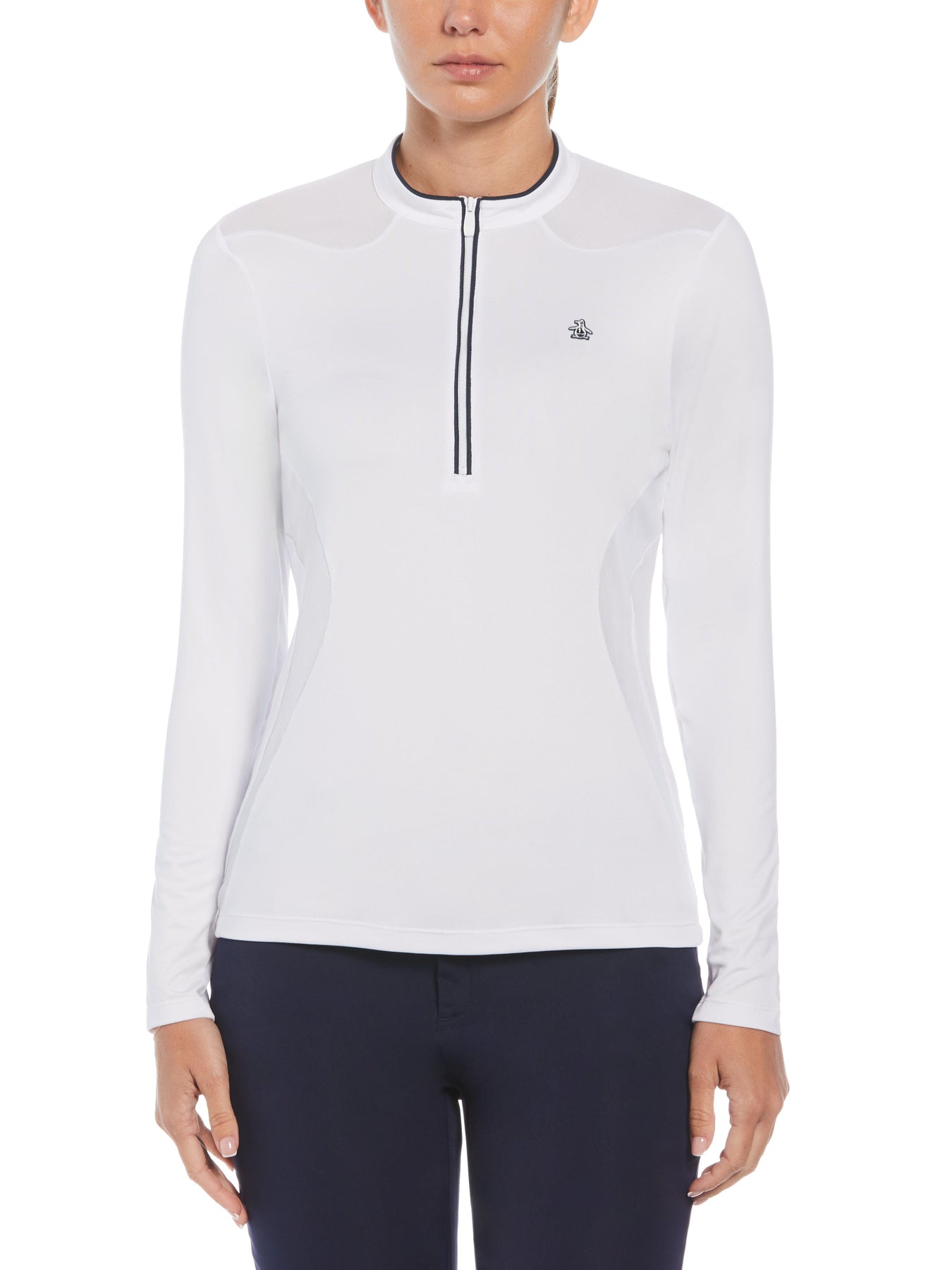 Layer up on the course with this women's long sleeve golf shirt from Original Penguin. Designed for optimal comfort and performance, this lightweight golf top includes moisture-wicking technology and mesh inserts for breathability. Crafted from sustainable recycled fabric, this long sleeve golf shirt also features a solid color design and quarter zip closure for easy on and off and modern style.