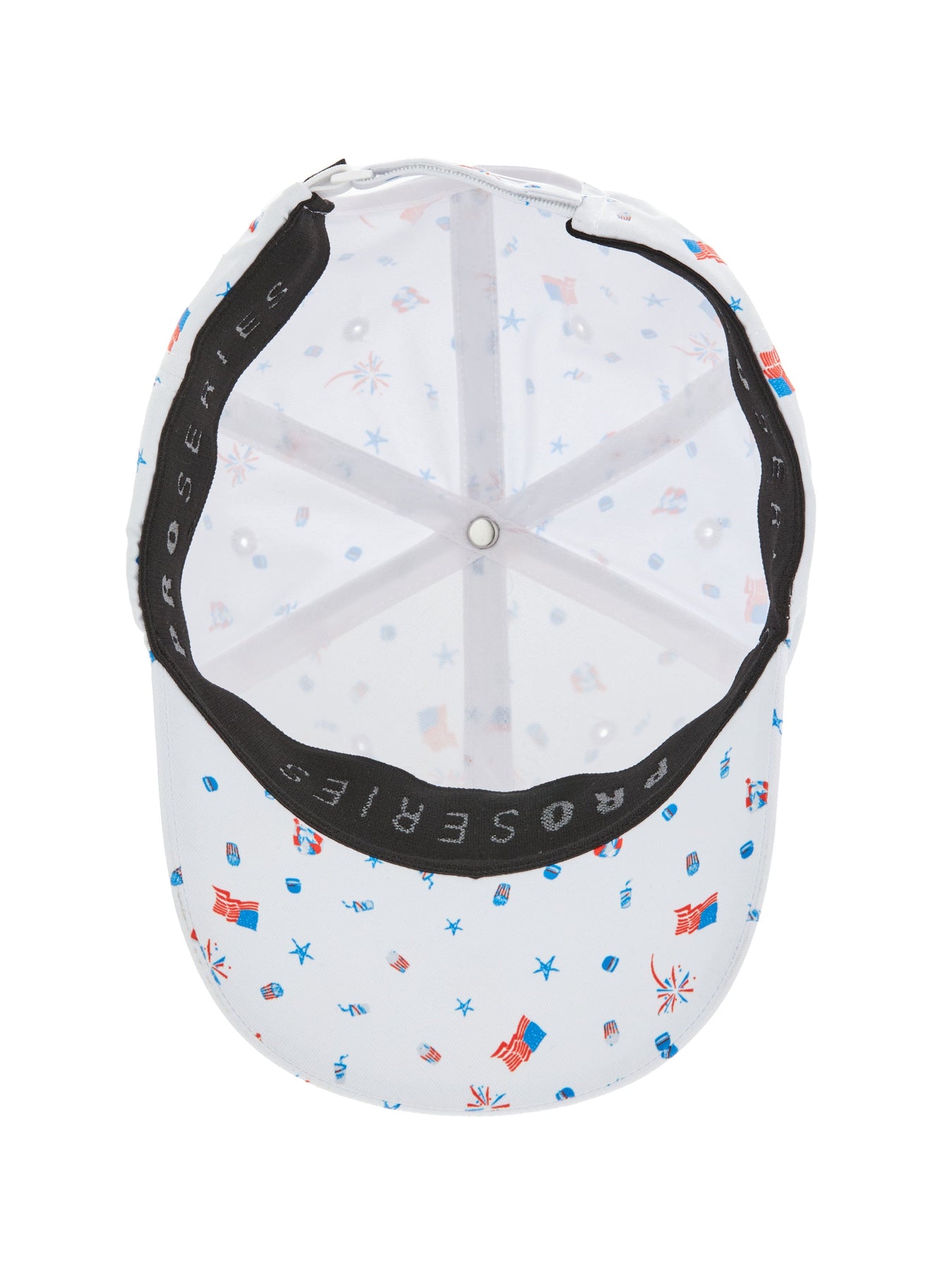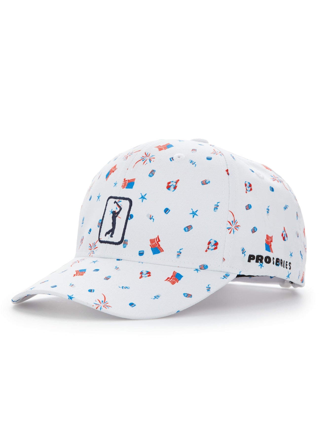 Show off your red, white, and blue pride on the green in this Americana Golf Cap from PGA TOUR. This baseball hat for men is crafted from durable polyester that stands up to regular wear and has a moisture-wicking band to help prevent sweat build-up. A curved brim helps keep the sun out of your eyes and built-in UPF protection helps block out the sun’s harmful rays. An all-over print of American flags and fireworks adds an eye-catching patriotic style to this casual golf hat.
