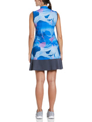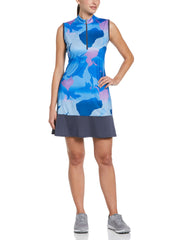 Impress with both your skills and your style out on the course in this elegant women’s golf dress from Callaway. The ladies’ golf dress is covered with an eye-catching abstract gradient print, with a contrasting solid-colored flounce hem insert for added visual impact. It has sun protection to help guard against harmful UV rays, while moisture wicking helps to move sweat away from your body to keep you feeling fresh and dry. The sleeveless golf dress is made from a double knit interlock fabric, which offers both a structured look and flattering natural stretch.