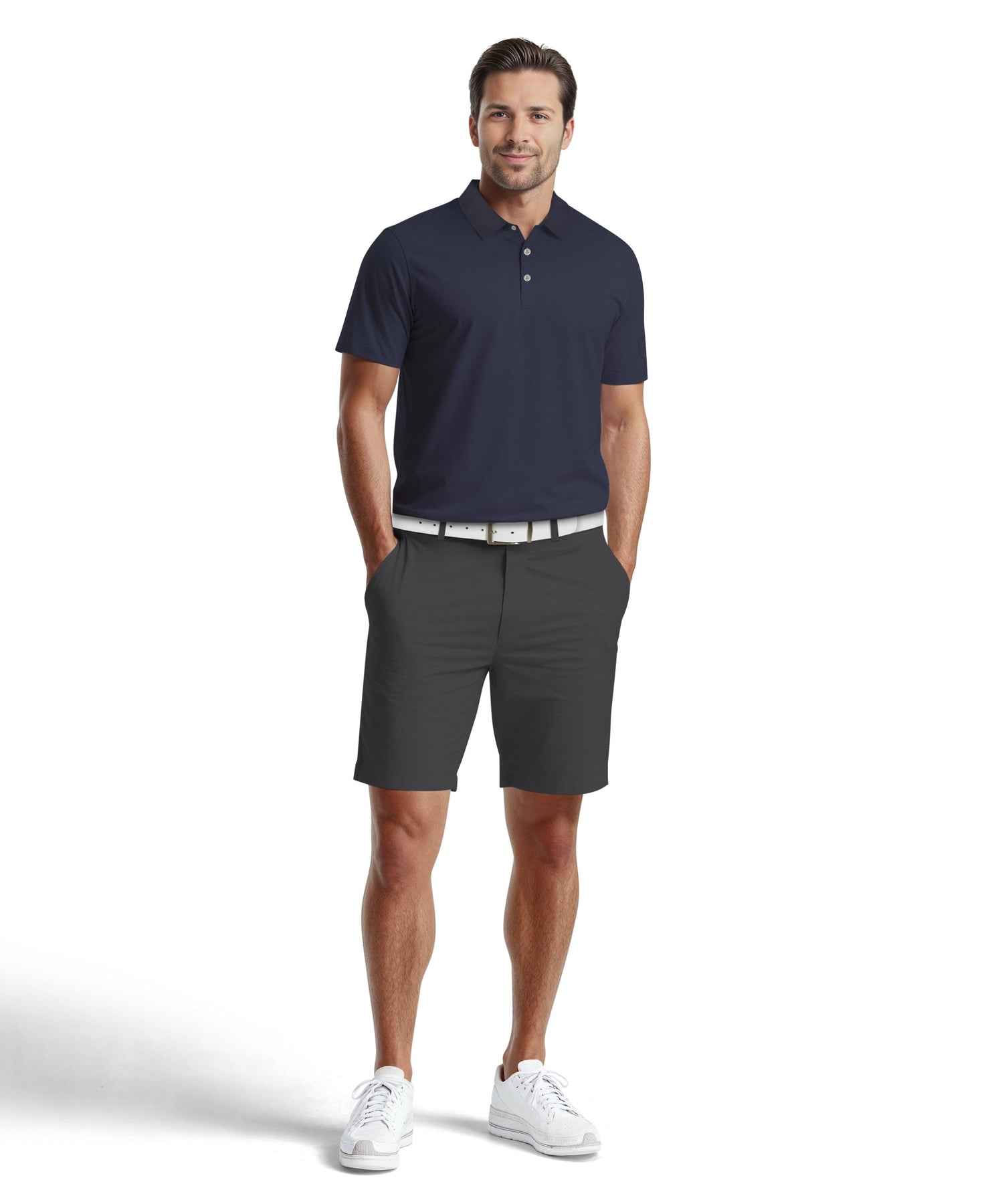 Great for warm and humid weather, this PGA TOUR Apparel golf polo shirt is crafted from lightweight mesh for breathability. Innovative Airflux ventilation adds even more airflow to help keep you cool as you play through your round, while moisture wicking moves sweat away from your body to help keep you dry. Sun protection provides valuable defense against damaging UV rays on bright, cloudless days. A practical addition to both your golf clothing and your everyday wardrobe, this polo top has a versatile solid-colored design that transitions smoothly from the office to the course.