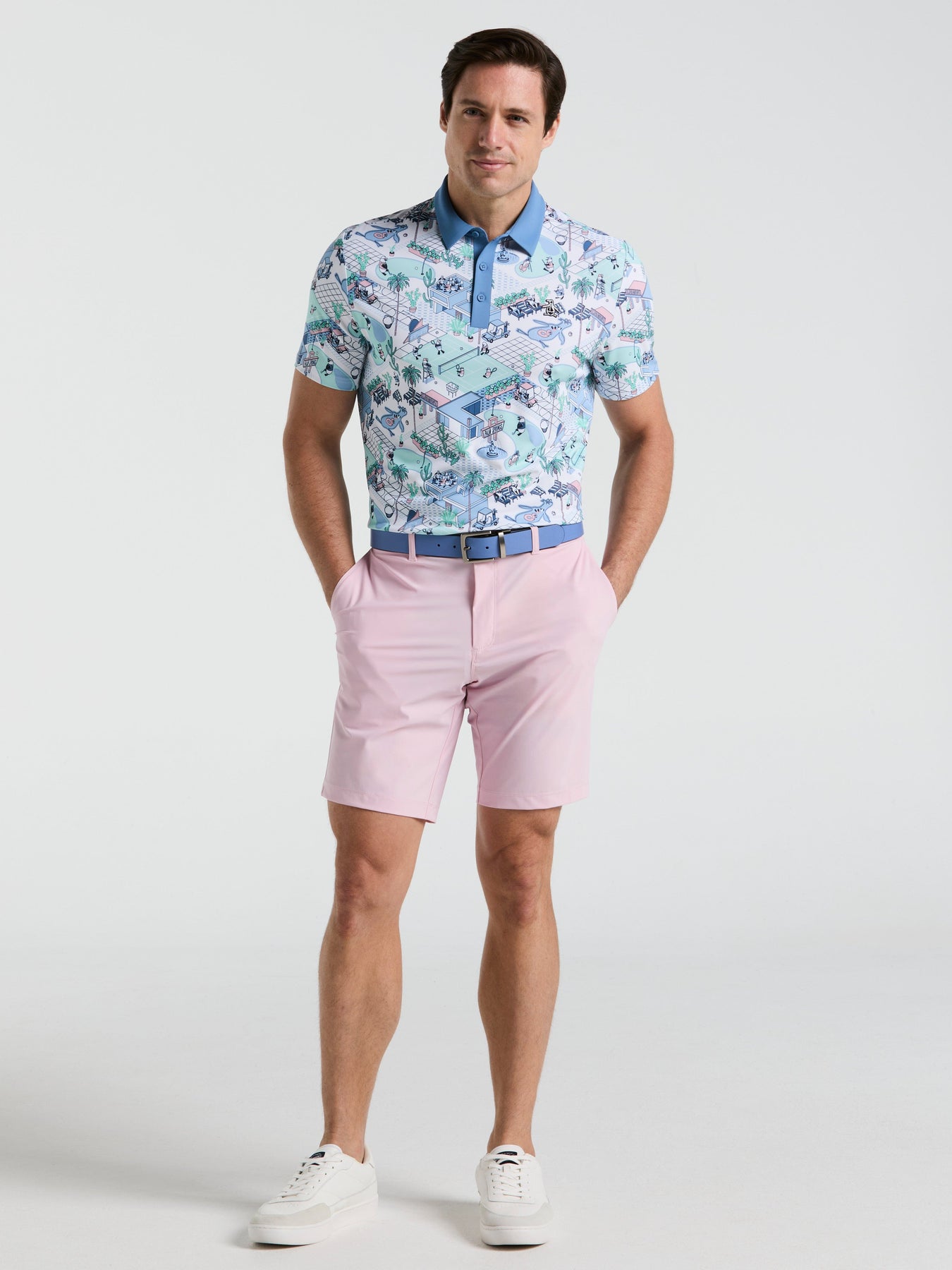 Bring a little fun to your golf attire with this Original Penguin men's polo featuring an eye-catching Palm Springs inspired print. The single knit fabrication is lightweight for sporting comfort, while added stretch delivers a superior fit with flex. On warmer days, the moisture-wicking fabric keeps you feeling dry and fresh. Your everyday polo shirts have met their match with this fun take on classic golf wear.