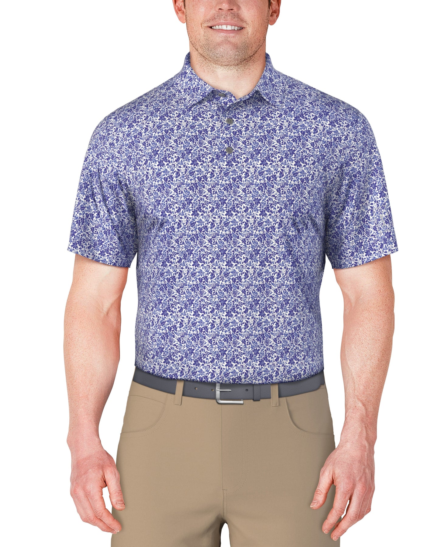 Make a style statement as you step out onto the course in this PGA TOUR Apparel golf polo shirt. The textured fabric and botanical print add stylish flair to step up your game day style. This golf top includes sun protection for added coverage and stretch shoulder seams so you can swing in comfort.