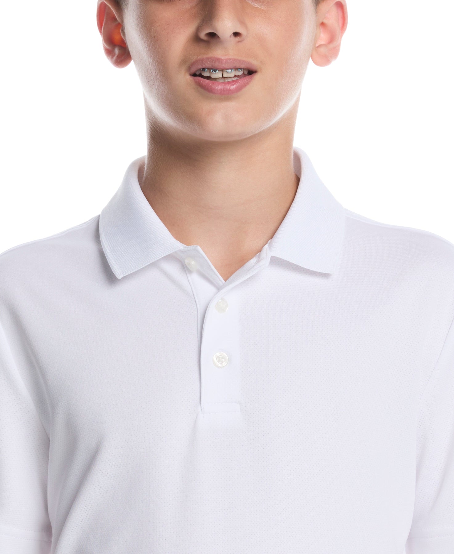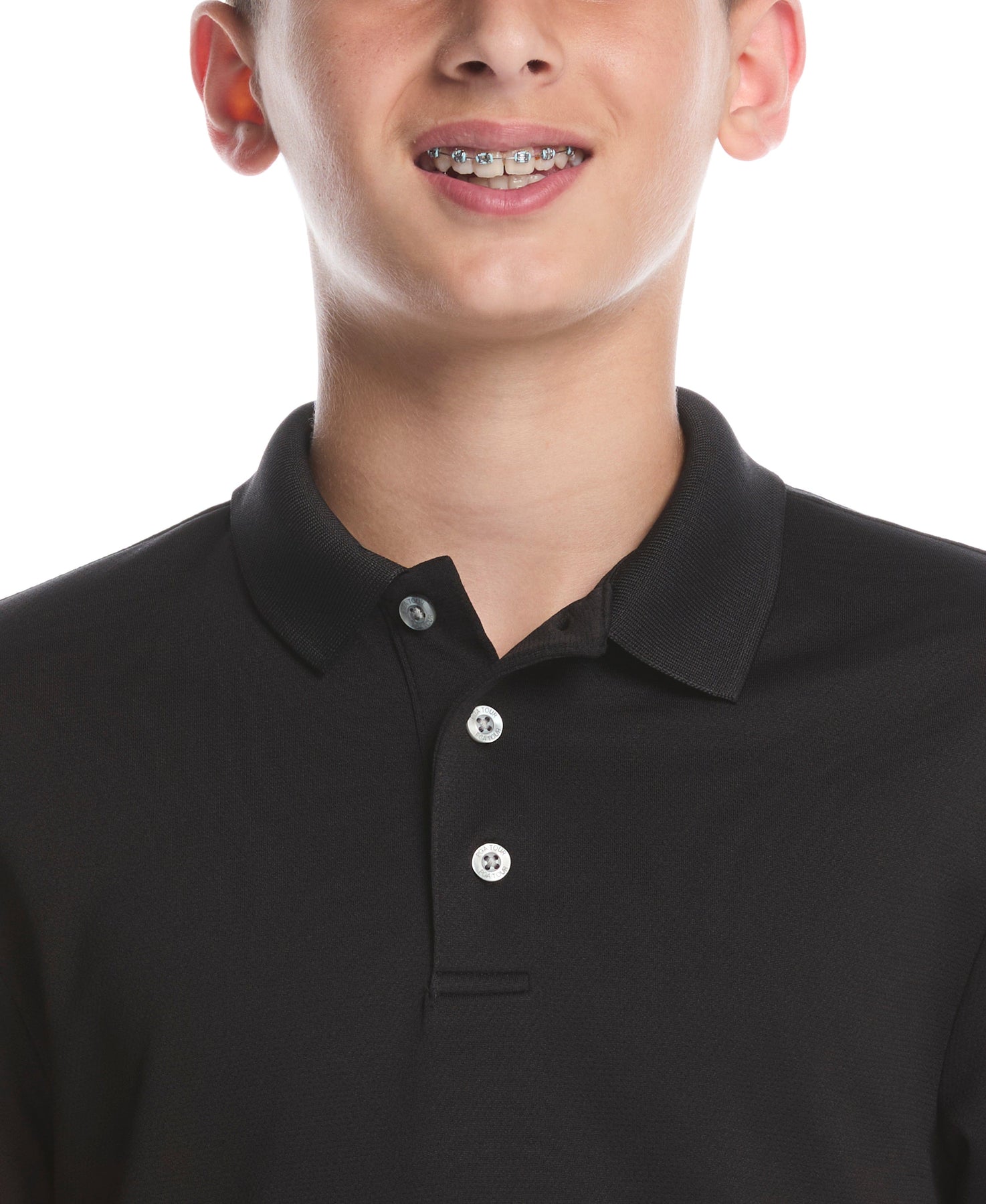 This solid PGA TOUR boy's polo shirt is made from AirFlux™ ventilated fabric to help keep him cool and comfortable. The breathable mesh golf polo incorporates moisture-wicking technology so he stays dry during his round. Designed for both fashion and function, a ribbed collar and three-button placket bring classic good looks to the innovative design.