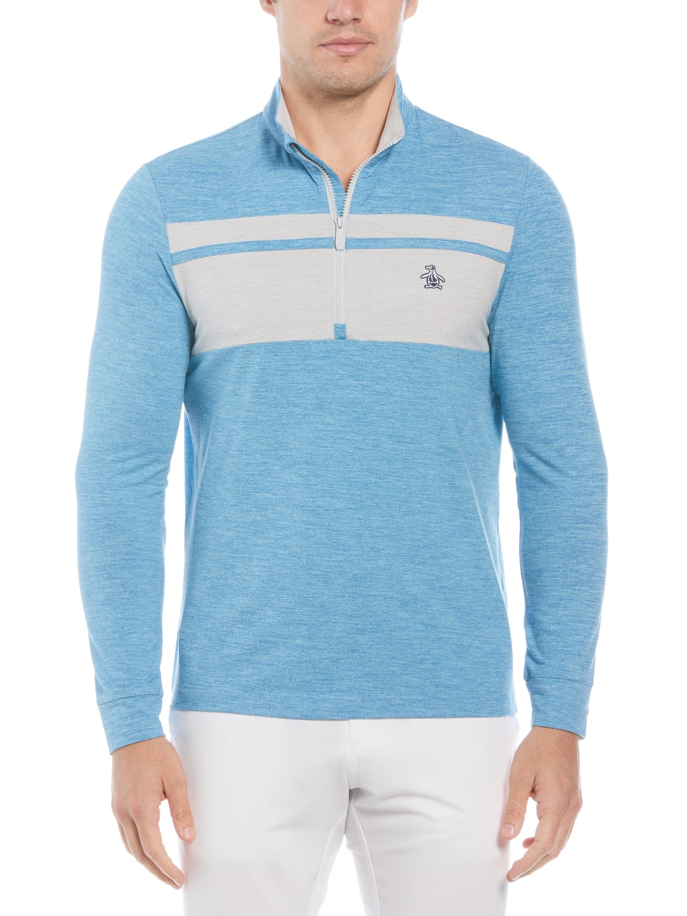 This Original Penguin men's quarter zip sweater is the ultimate essential for every stylish man's wardrobe. This versatile 1/4 zip sweater is crafted from a lightweight single knit fabric made from recycled polyester. Added stretch ensures maximum comfort. Featuring eye-catching color block stripes on the chest, this sweater is perfect for elevating your casual wear. The 1/4 zip closure adds a touch of practicality, making it easy to layer over your favorite tees.