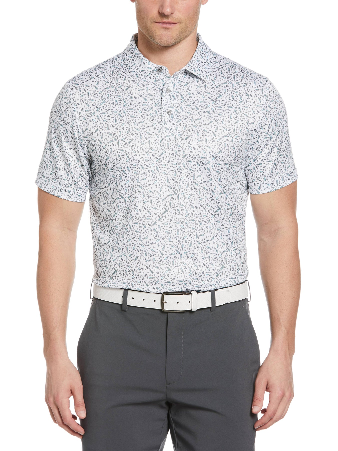 A fun conversational print helps this PGA TOUR APPAREL men’s golf polo stand out, while still being versatile enough to pair with a wide variety of bottoms. Interlock fabrication provides natural stretch for all-day comfort while the stretch shoulder seams allow for flexible freedom of movement. This short-sleeve golf shirt is equipped with moisture-wicking and sun-protection properties for added comfort on your golf days.