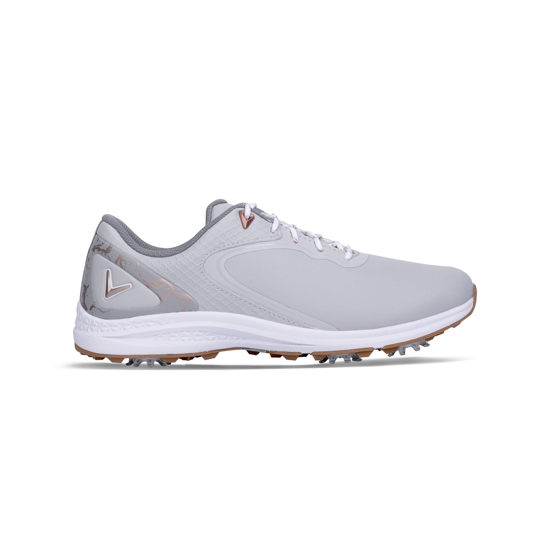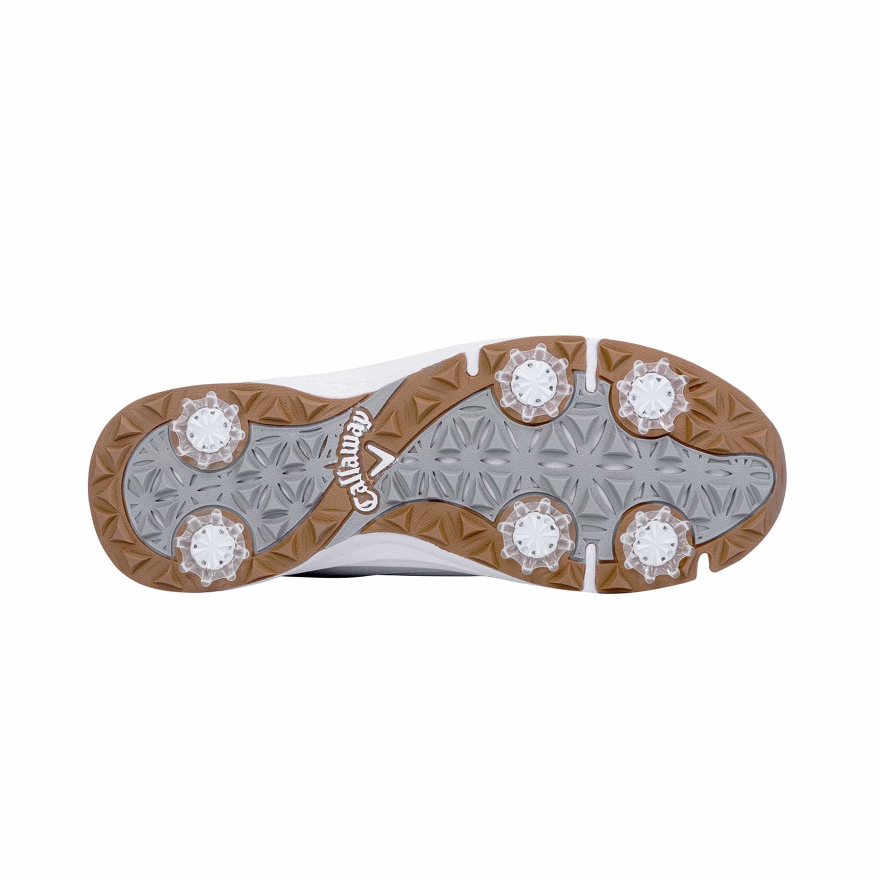 Designed with stability in mind, the Callaway Coronado v2 women’s golf shoes feature spiked dura-rubber outsoles to help you maintain your footing on slick wet grass. Great for changing weather conditions, the golf shoes for women feature durable microfiber leather uppers with Opti-Dri™ waterproof protection to help prevent your feet from getting soaked during wet weather. The lightweight Forged DX™ EVA midsoles and PLUSfoam insoles provide essential underfoot cushioning, while Opti-vent™ mesh liners add breathability to help keep your feet cool. The Pulsar cleats are removable, making them easy to clean or replace as needed.