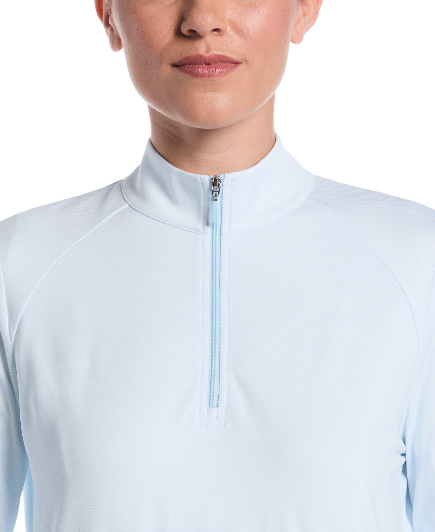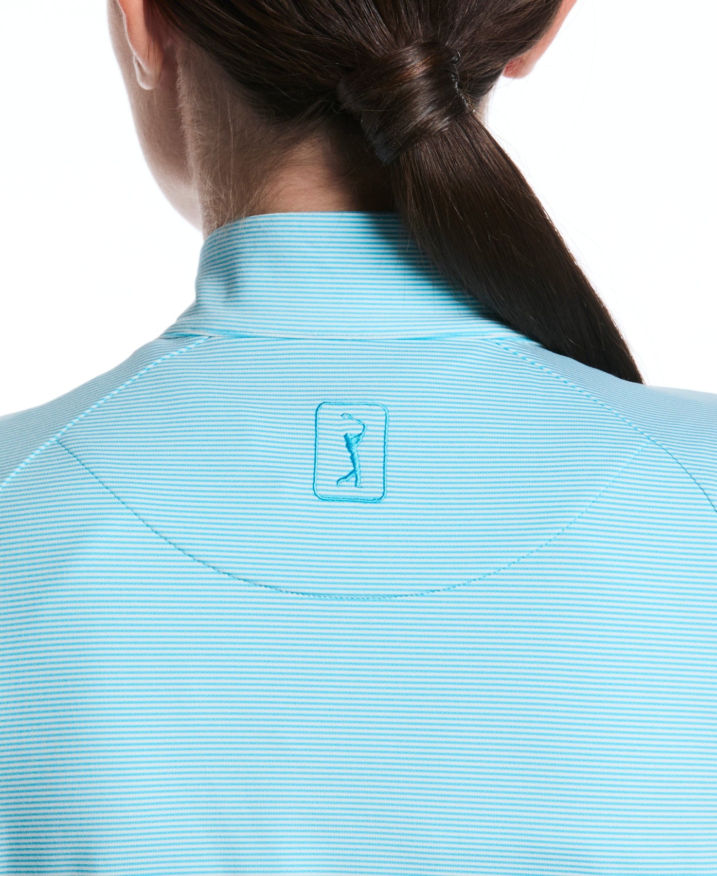 Play on the course no matter the weather in this PGA TOUR Apparel women's long sleeve golf top. The water repellent finish helps you stay dry while the quarter zipper closure lets you layer and adjust to your comfort. This quarter zip golf shirt is finished with a feeder stripe print for a sporty look.
