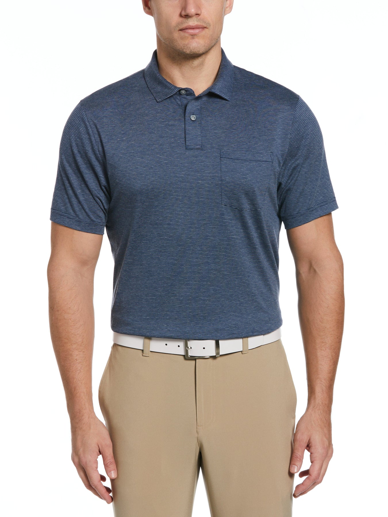 Classic style and modern eco-friendly technology meet in this contemporary men’s golf polo from PGA TOUR APPAREL. Made in part from recycled plastic bottles, the soft jersey material has built-in moisture-wicking properties and sun protection to keep you cool and dry. Stretch seams give you all the mobility you need on the course while the subtle lined pattern makes this golf wear classic great for life off the green.