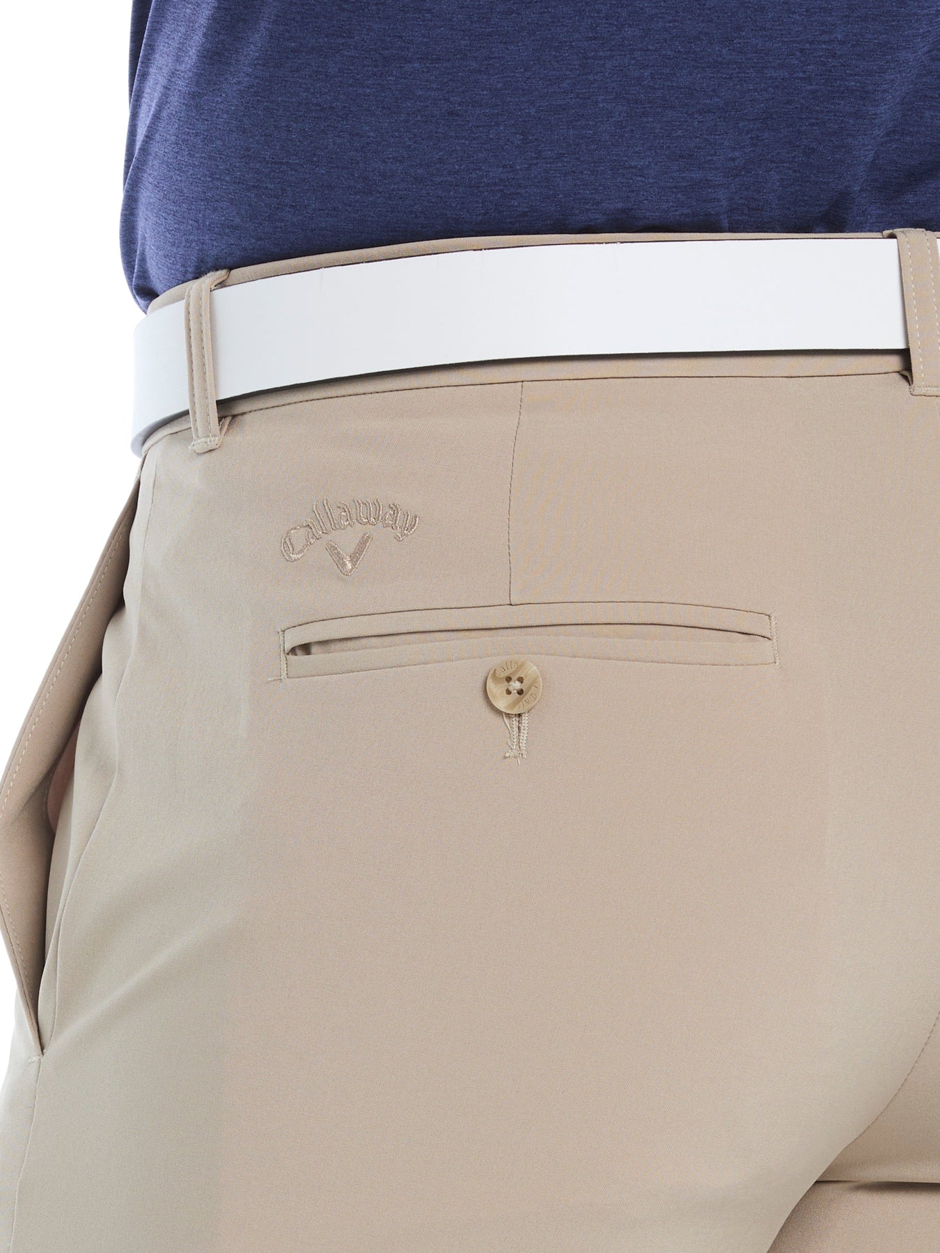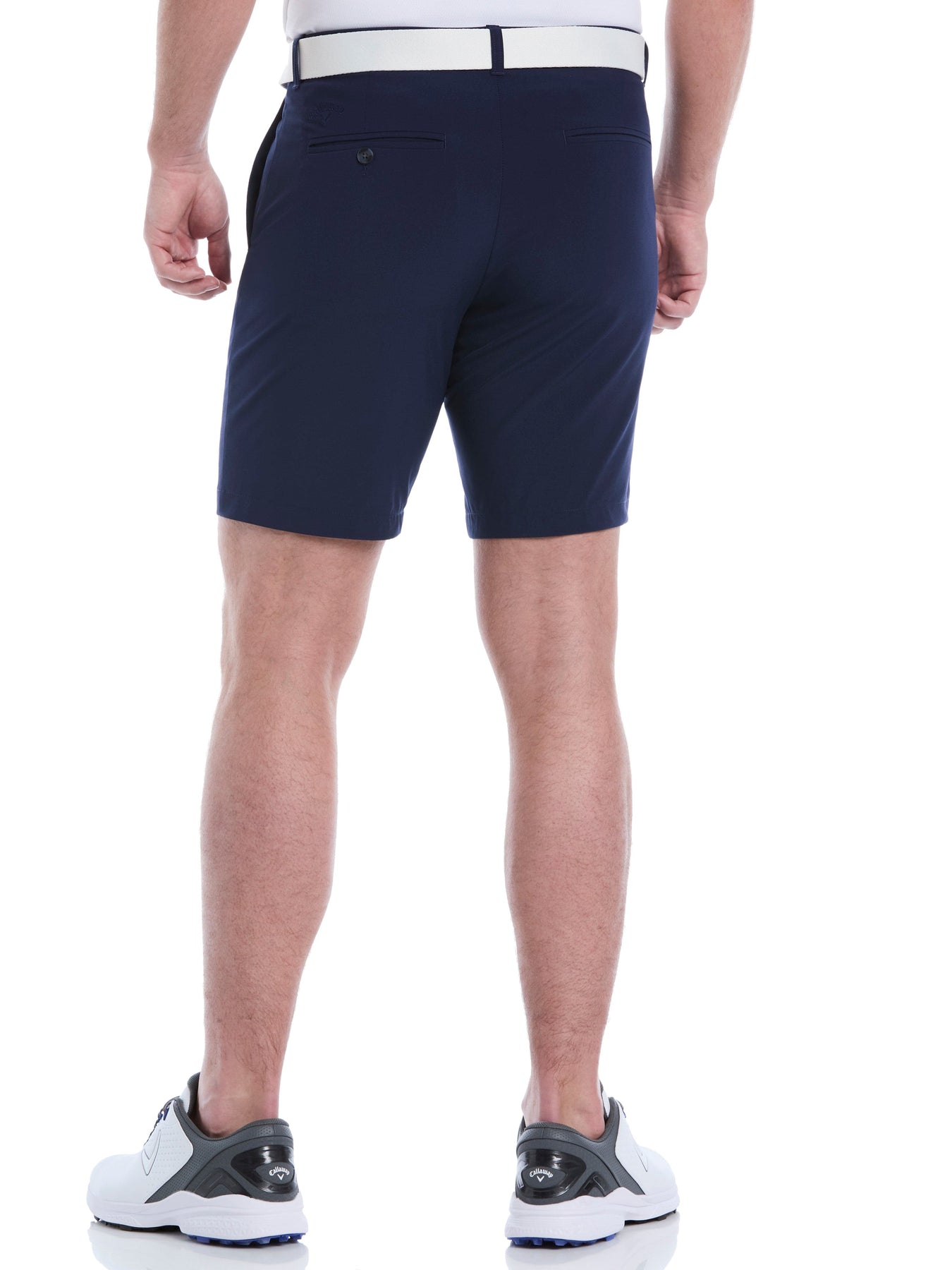 A practical addition to any guy’s golf wardrobe, these Callaway flat front shorts have a sleek solid-colored design that complements almost any top with ease. The men's golf shorts feature stretch in both the fabric and waistband for a comfortable and flexible fit. They’re crafted with a tight plain weave pattern that stands up well to regular wear and washing. Sun protection helps to block damaging UV rays, while moisture wicking helps to keep you dry during long rounds.