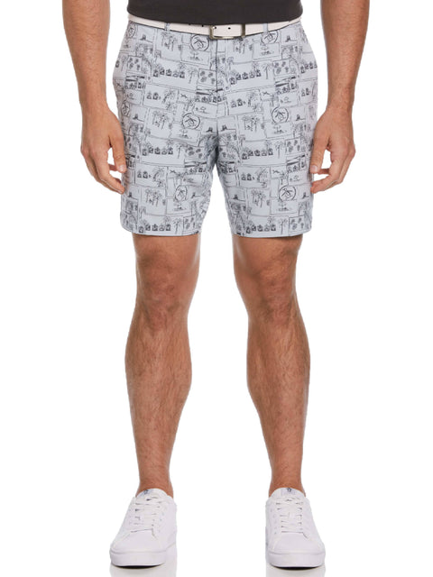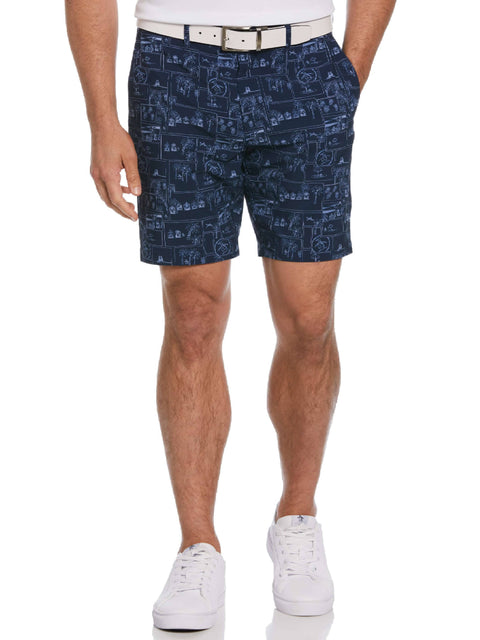 Designed for comfortable performance and style, these men's golf shorts from Original Penguin provide the versatility and comfort needed for a day on the course. Featuring a plain weave fabric for durability and long-lasting wear, these golf shorts also sport an allover beach club print to deliver a unique blend of fashion and functionality that's just right for both the course and the clubhouse. The 8-inch inseam ensures a comfortable fit while maintaining a sleek appearance.
