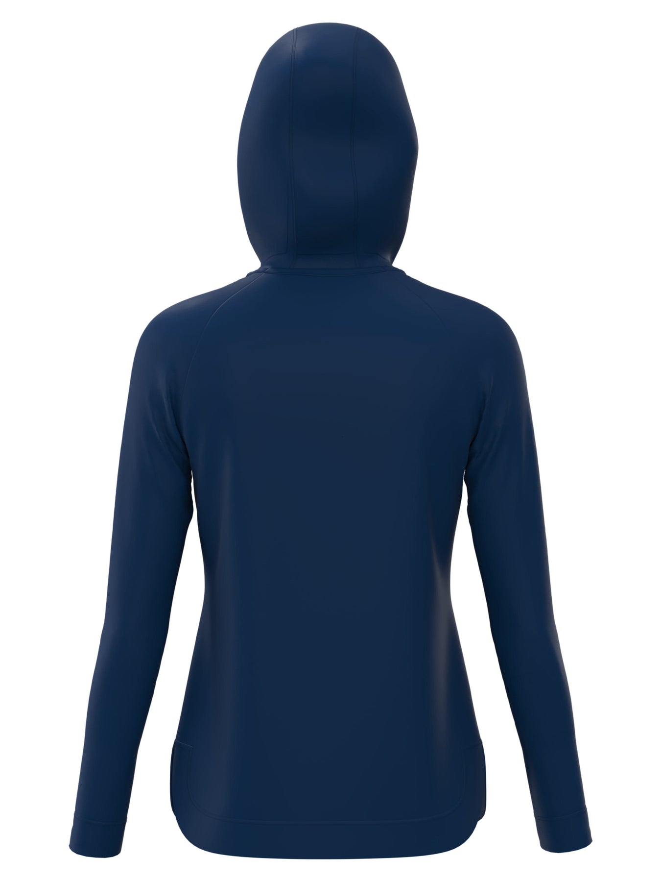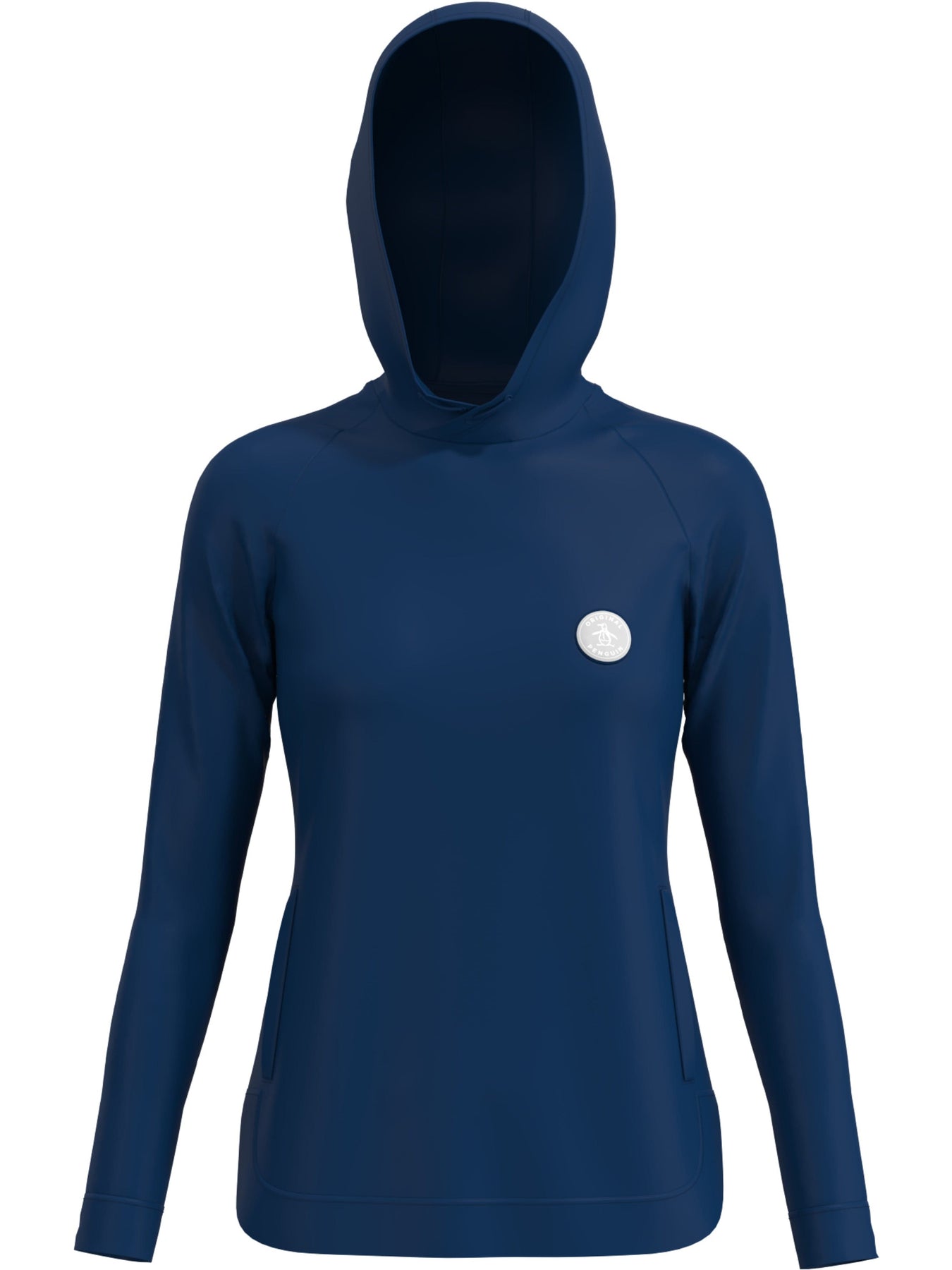 When the weather cools, layer up with this Original Penguin women’s golf hoodie and keep playing. Interlock fabrication enhanced with stretch provides a flexible fit that moves with you and the comfy hood adds an extra layer of coverage when you need it. On or off the course, this golf pullover has you covered with its long sleeves, handy kangaroo pocket and fashionable rounded hem. A logo patch at the left chest adds a fashionable finishing touch. Made with 35% recycled polyester, it's a sustainable choice you can feel good about.