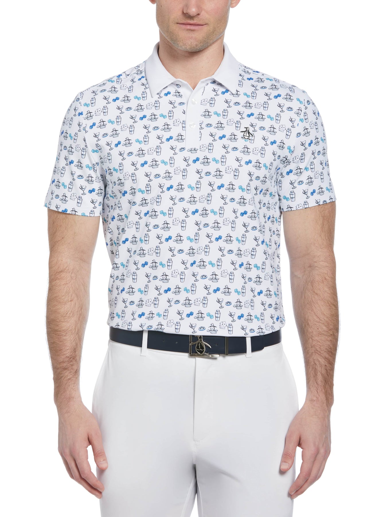 Original Penguin's golf polo shirts are a sustainable choice, crafted from recycled polyester. These golf tops are lightweight, stretchy, and designed with a retro martini print. Short sleeves offer comfort, while the single knit fabric ensures durability. Ideal for golf clothing, they feature moisture-wicking technology to keep you dry and comfortable during your game. Embrace eco-friendly fashion on the golf course with these stylish and functional polo shirts.