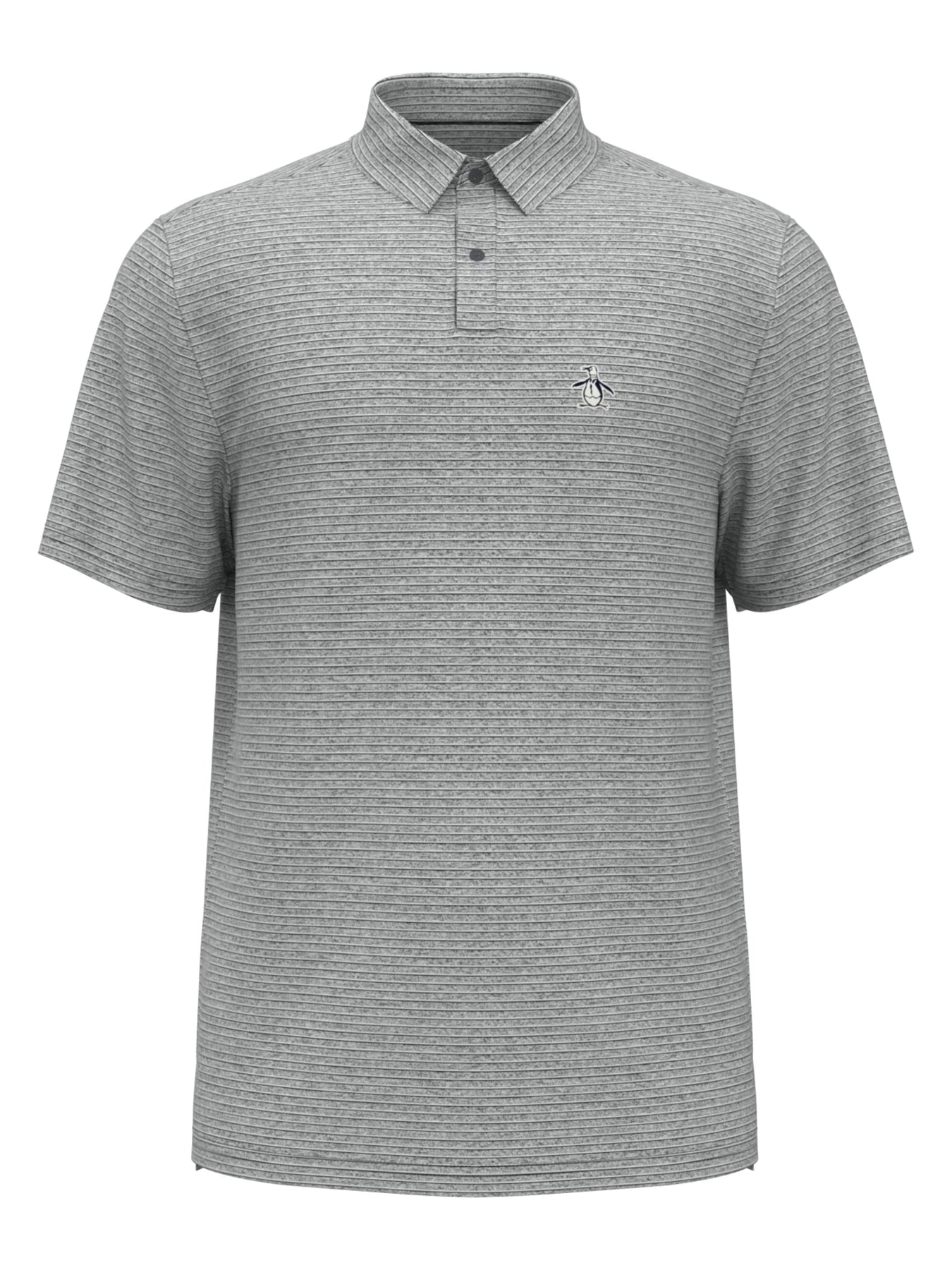 Every casual wardrobe deserves a versatile golf shirt. Look and feel your best on golf days, or any day, in this Original Penguin short sleeve men’s golf polo. The subtle striped print effortlessly complements a wide range of bottoms and the durable double-knit fabric is enhanced with stretch for a flexible fit that moves with you. A comfortable self collar with two-button placket allows for easy on and off and a sticker Pete logo at the left chest adds the perfect finishing touch.