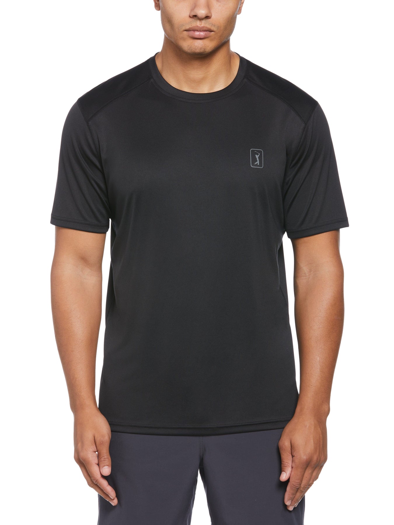 Look and feel like a winner course in this PGA TOUR men's crew neck golf shirt on or off the course. Double-knit fabrication offers durability and performance stretch fabric allows for a greater range of motion with every swing. This comfortable short sleeve golf top is equipped with moisture-wicking technology to help you feel dry and sun-protection technology to help keep skin safe from UV rays. The versatile solid color pairs well with the rest of your golf attire and a PGA TOUR logo at the left chest adds a sporty finishing touch. It's the perfect choice for golf days and casual days.