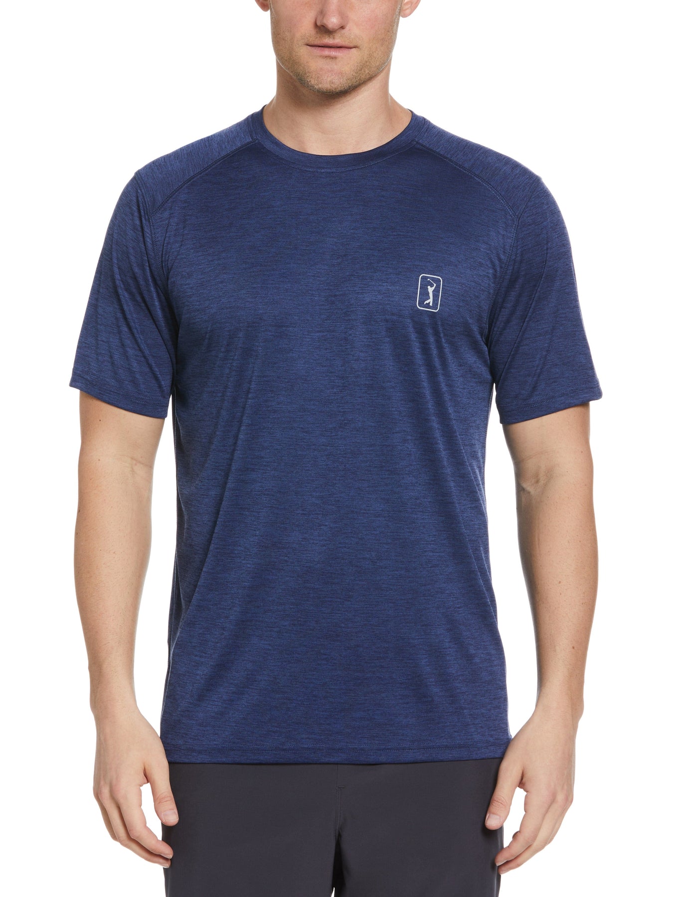 Look and feel like a winner course in this PGA TOUR men's crew neck golf shirt on or off the course. Double-knit fabrication offers durability and performance stretch fabric allows for a greater range of motion with every swing. This comfortable short sleeve golf top is equipped with moisture-wicking technology to help you feel dry and sun-protection technology to help keep skin safe from UV rays. The versatile solid color pairs well with the rest of your golf attire and a PGA TOUR logo at the left chest adds a sporty finishing touch. It's the perfect choice for golf days and casual days.