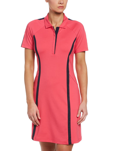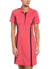 Hit the course with confidence in this flattering and functional plus size women’s golf dress from Callaway. Color blocking adds fresh, sporty style and the slimming TrueSculpt™ short comfortably smooths your shape for a flattering silhouette. Swing Tech™ fabric with added stretch ensures flexibility with every swing and this short sleeve golf dress is equipped with moisture-wicking Opti-Dri™ technology to help keep you feeling dry. Cooling and sun protection technology help you stay cool and protected during long sunny days on the course and a self polo collar with snap-button closure allows for easy on and off.