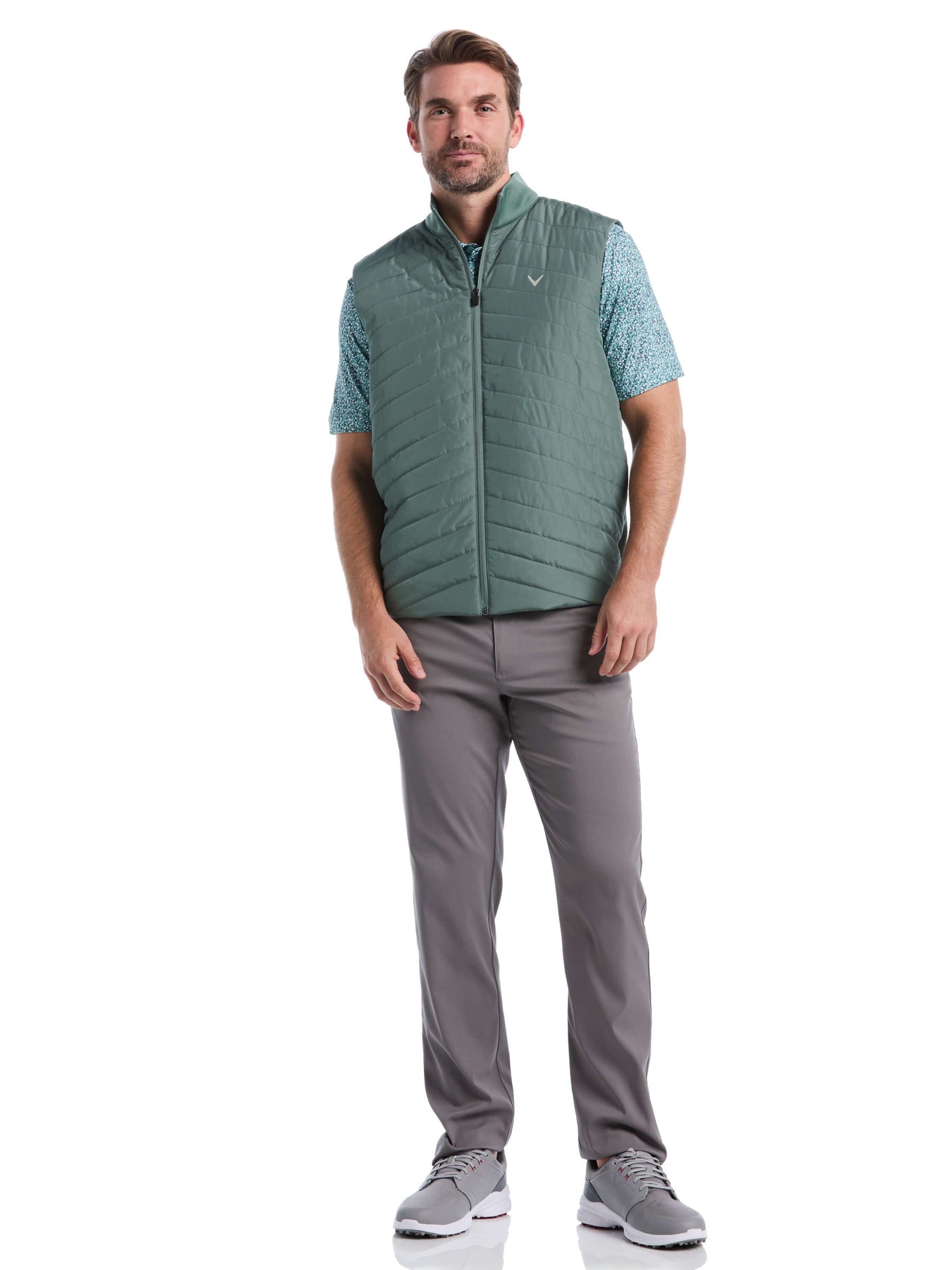 This golf vest from Callaway Apparel is a smart layering piece, offering sleek warmth without hindering your swing. Its quilted front panel provides lightweight insulation from durable plain weave fabric that stands up to daily wear. Enjoy sun protection and easy temperature adjustment with the full-zip closure. Partially lined for comfort, this versatile, solid-colored vest also features front pockets for small essentials.