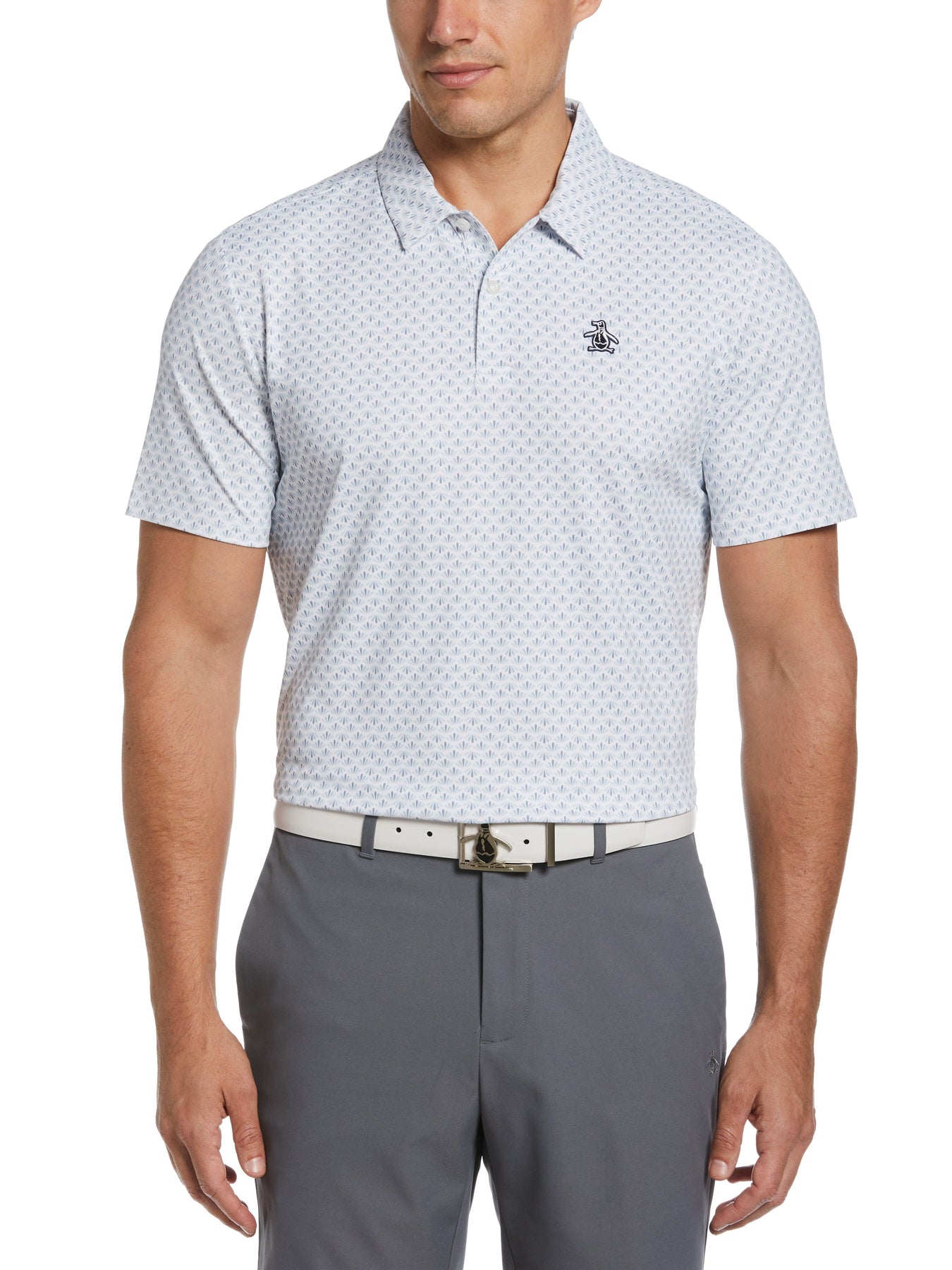 An allover geo print brings a fun retro vibe to this Original Penguin men’s golf shirt. The single knit fabric is enhanced with stretch for flexible comfort as you bend and swing and it includes 30% recycled polyester. With its comfortable self collar, breathable short sleeves, and distinctive Pete sticker logo, this golf top is an easy choice whether you're heading out for a few rounds of golf or a few rounds of drinks.