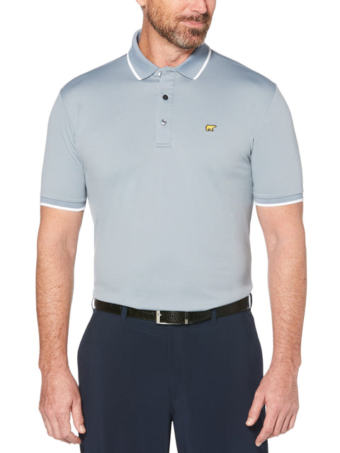 Giving the classic solid-colored golf polo a sophisticated update, this Jack Nicklaus design features contrasting tipping on the collar and cuffs. The men's golf shirt is crafted with a textured fabric for added visual interest, and it features practical performance technologies for enhanced comfort out on the green. The polo is equipped with sun protection to help prevent annoying end of day burns. Moisture-wicking fabric pulls perspiration away from your skin to help keep you cool and dry, while the top's innovative seams allow for a comfortable range of motion.