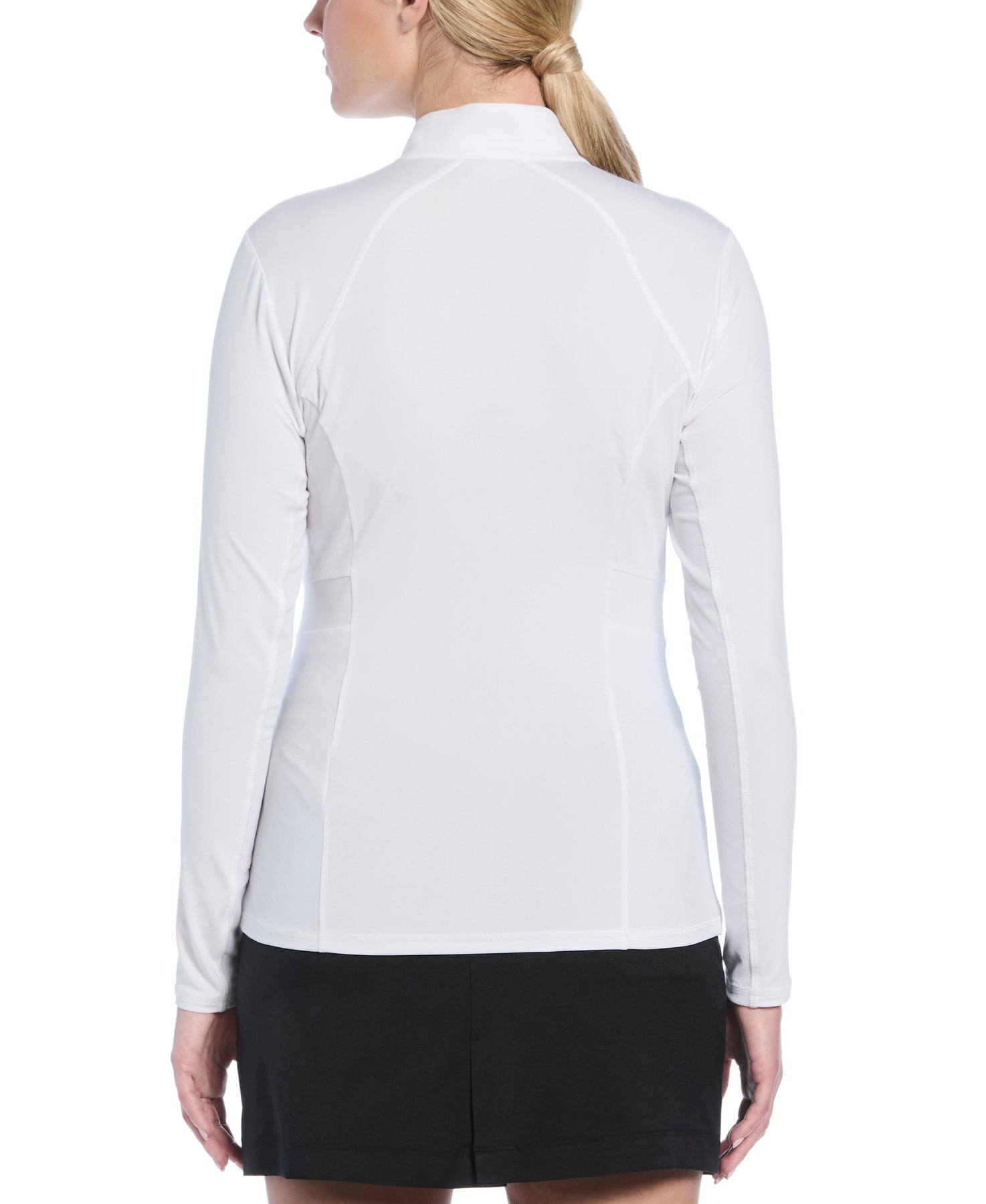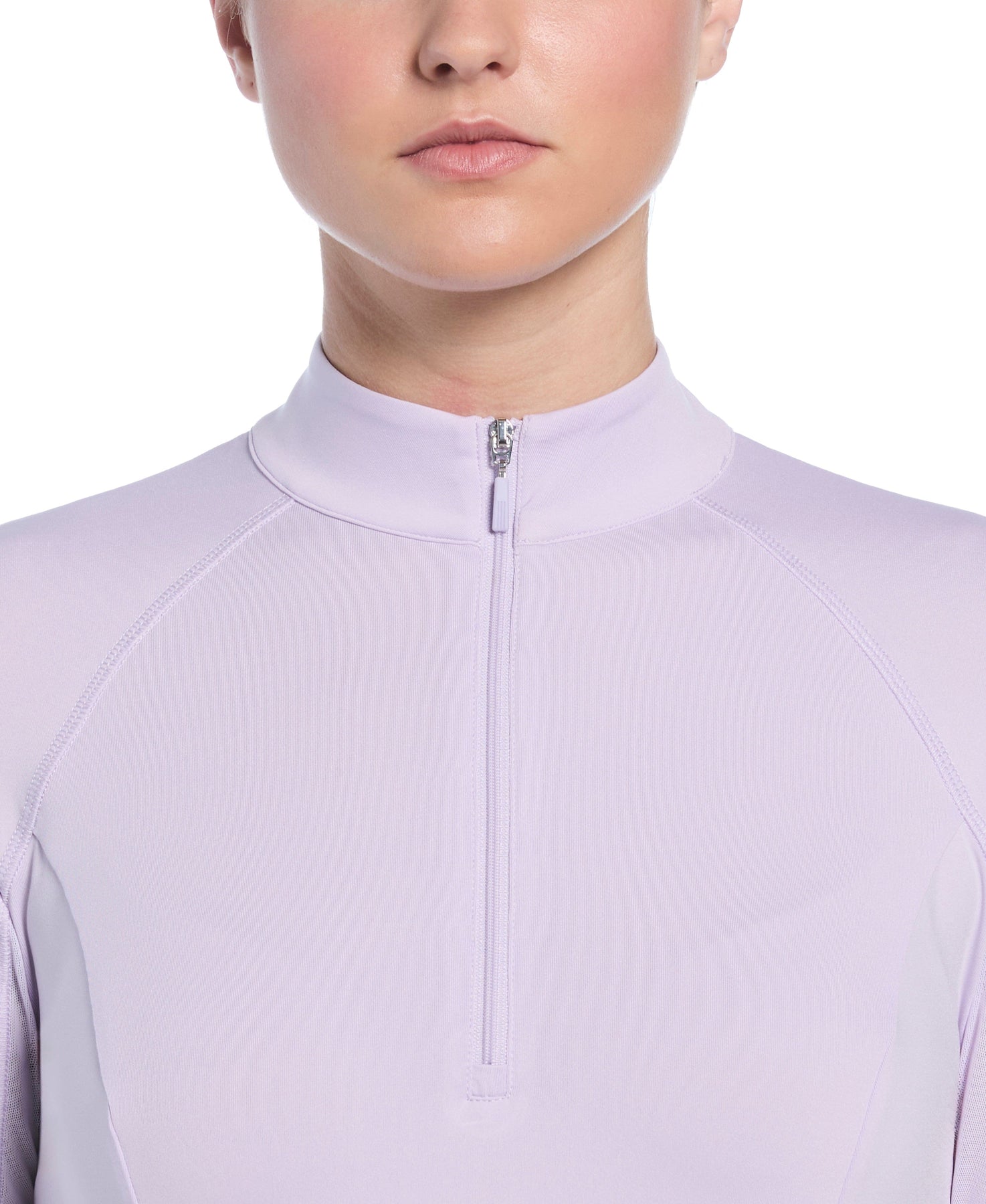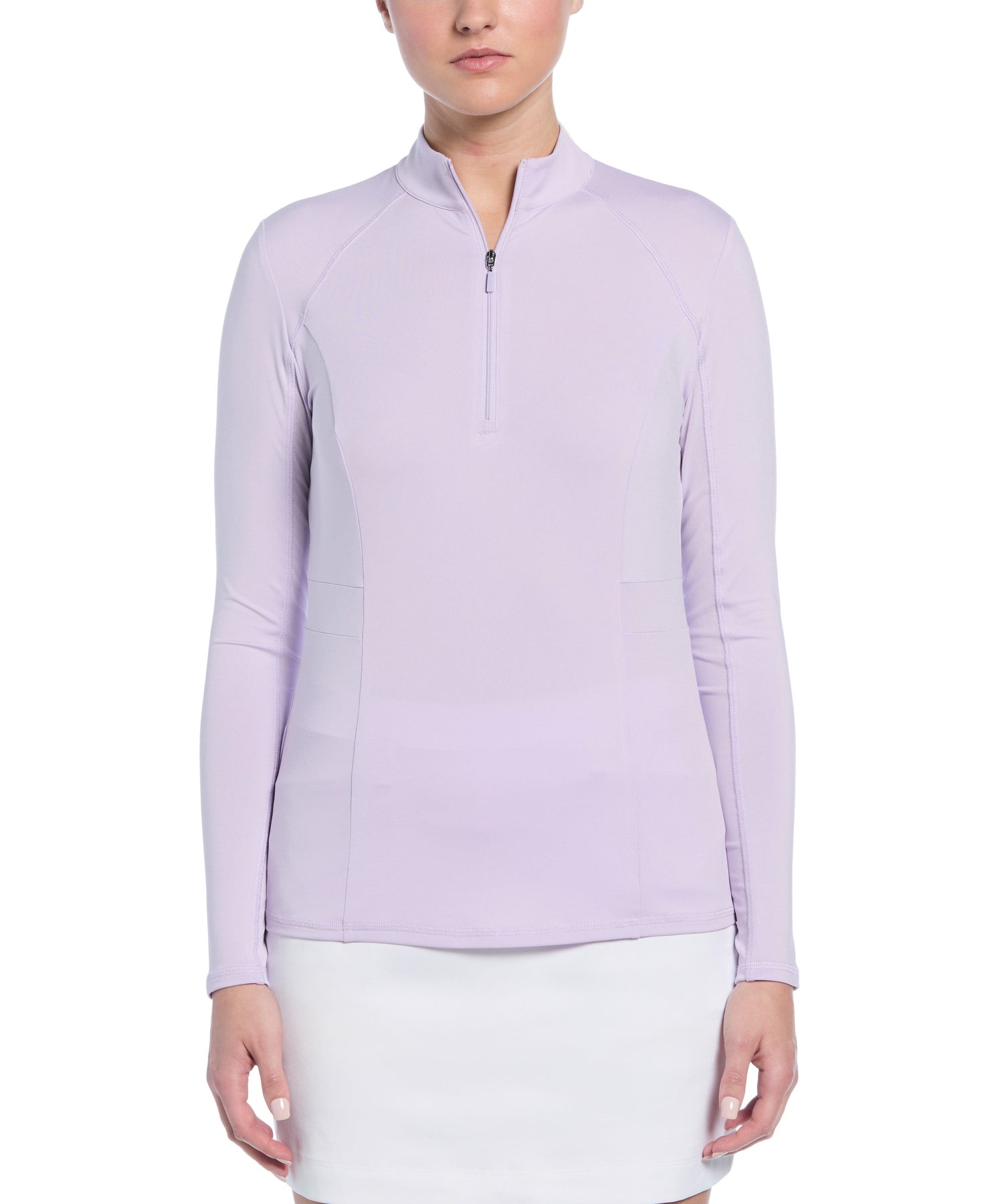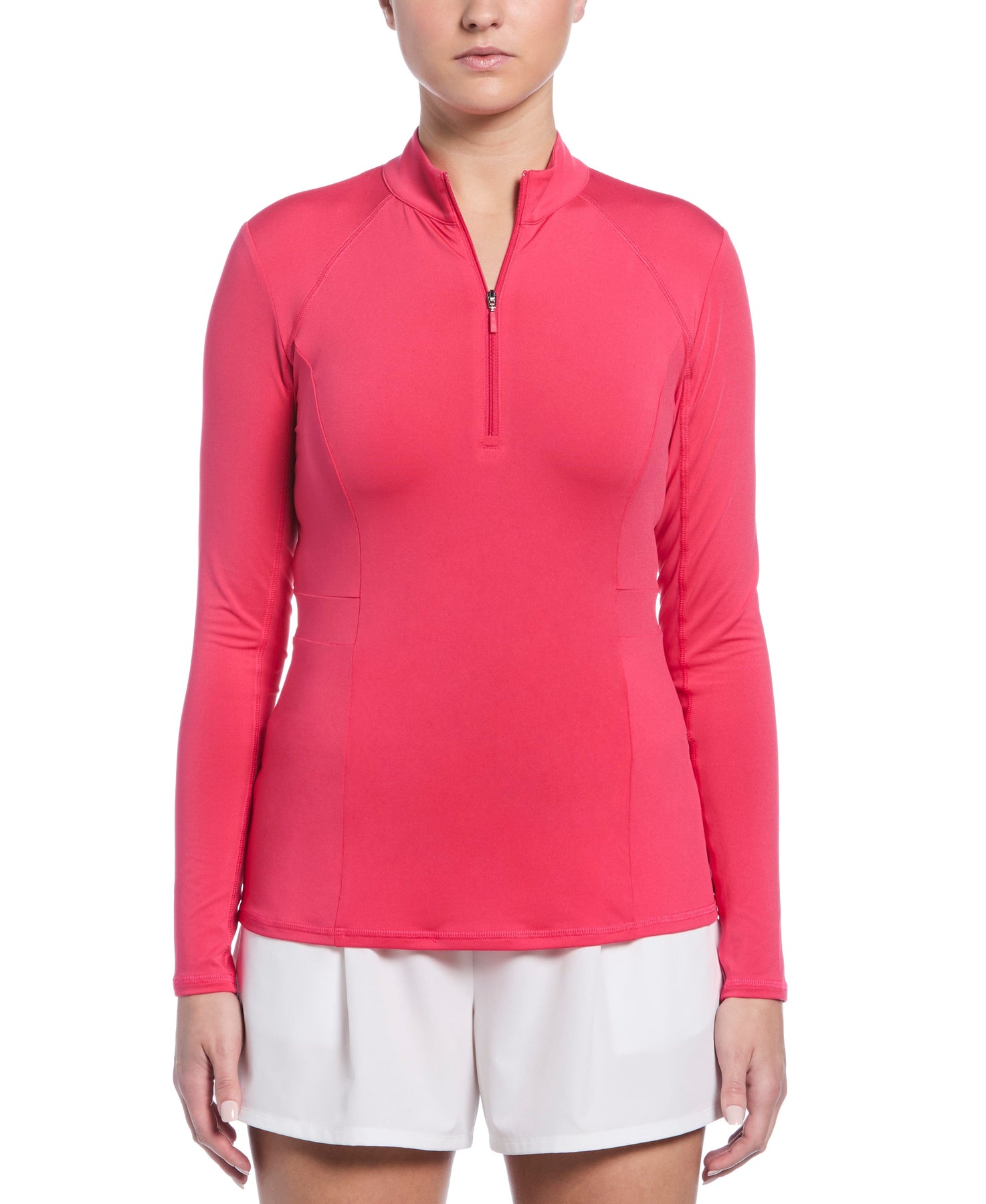 This PGA TOUR Apparel women's long sleeve golf top provides enhanced coverage on really sunny days. The sun protection helps block harsh UV rays for peace of mind. This golf top includes a half zipper closure for adjustable comfort. Moisture wicking keeps you feeling dry while stretch shoulder seams allow you to swing with ease.