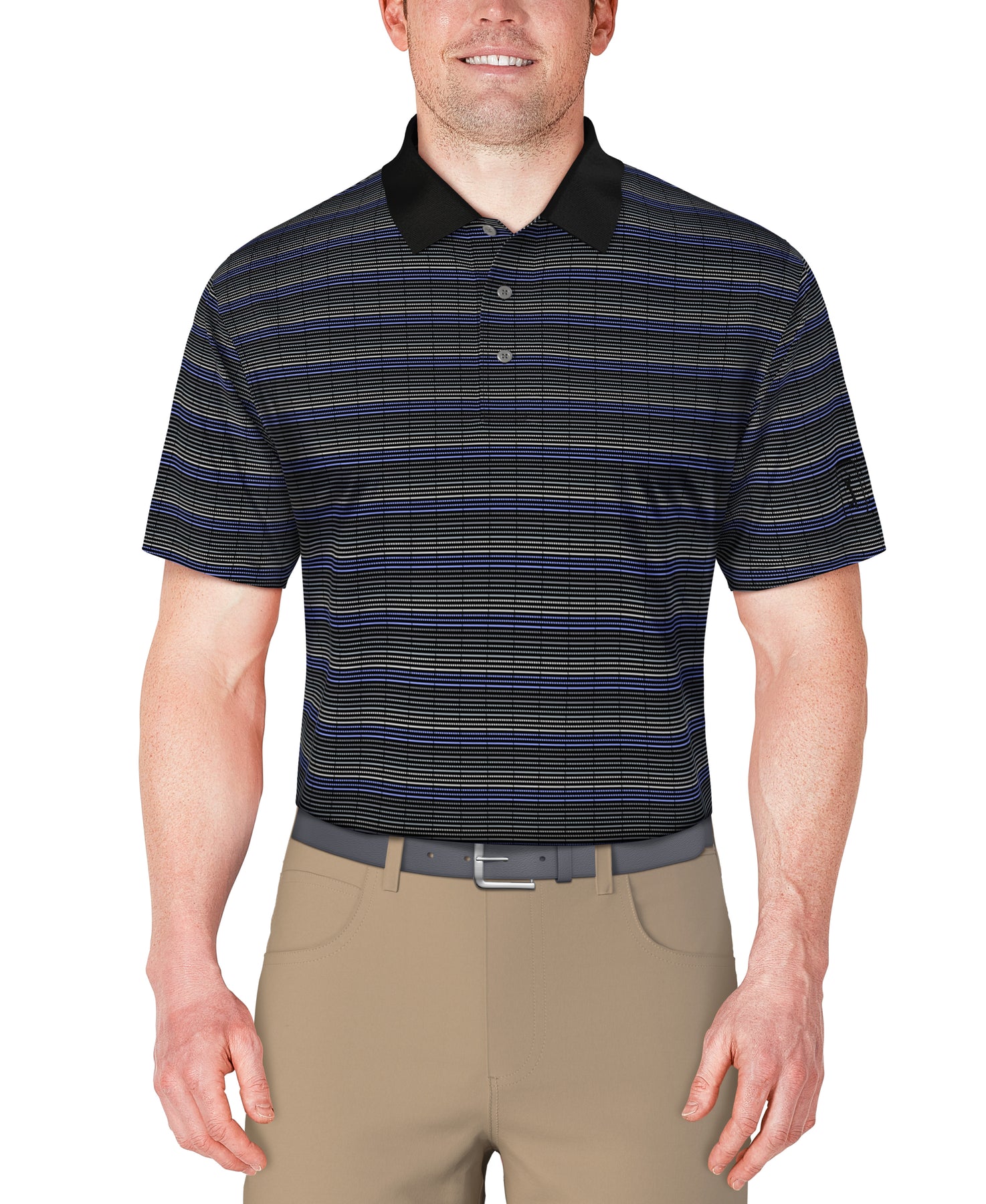 This Men's Short Sleeve Jacquard With Solid Rib Collar Golf Polo Shirt from PGA Tour features a premium jacquard pattern for a unique look, while moisture-wicking technology helps keep you cool and dry on the course. Built-in sun protection safeguards your skin from harmful UV rays, and the double-knit fabric ensures durability and a premium feel. The stretch shoulder seams allow for full range of motion during your swing, making it the perfect choice for golfers seeking both style and performance.