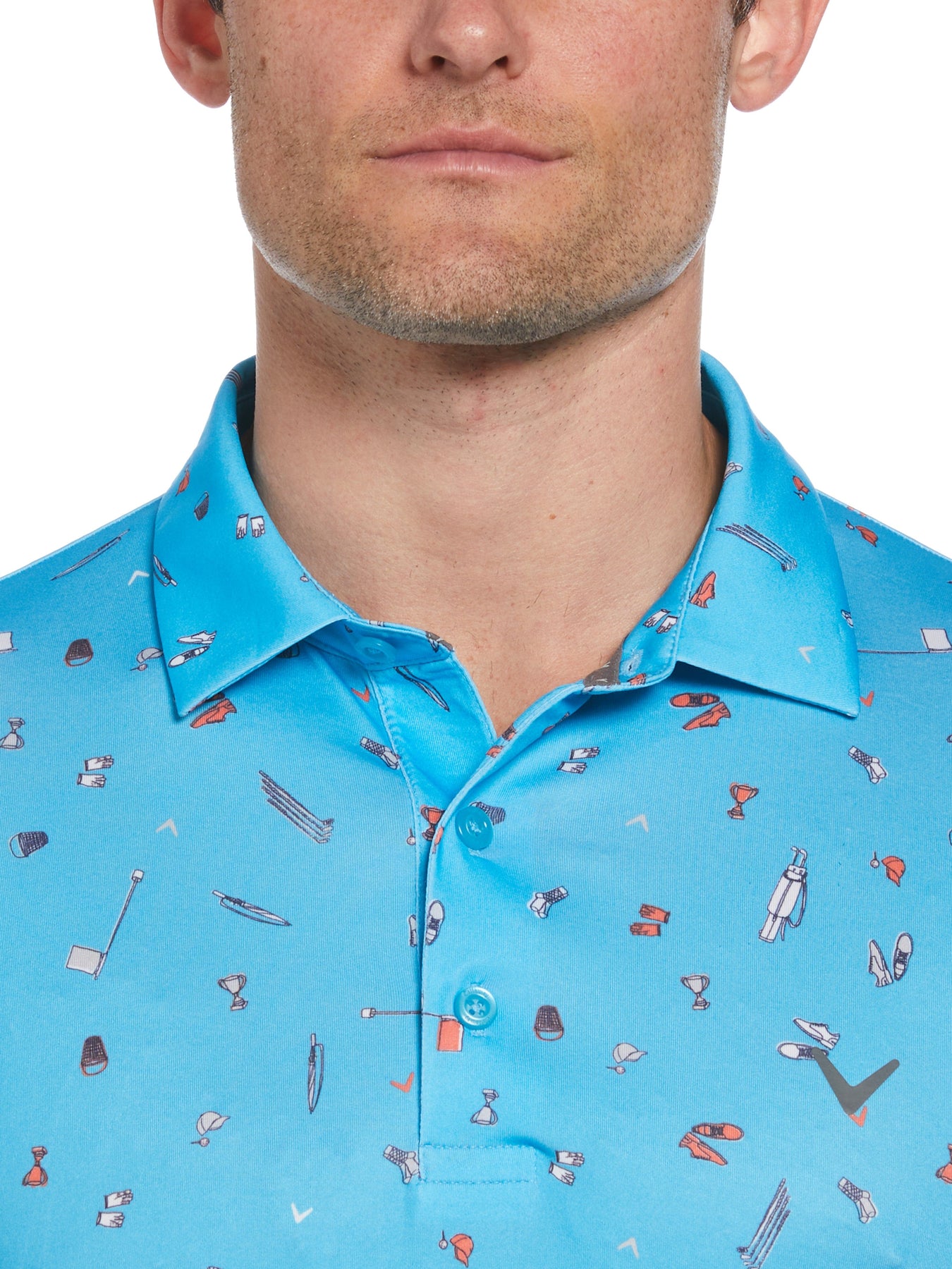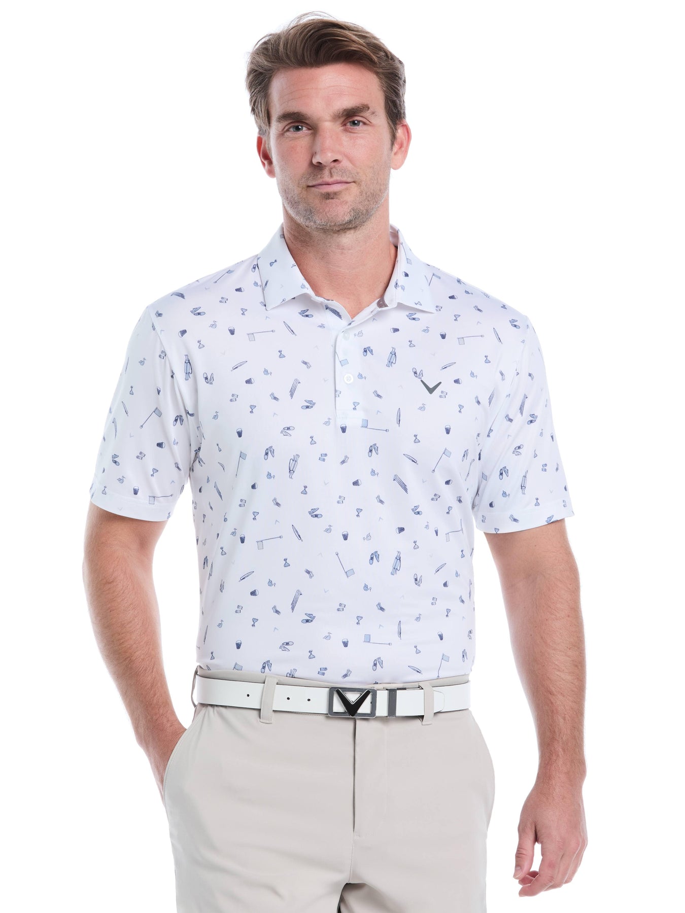 Stay stylish and comfortable on the course in this men's golf shirt from Callaway. This golf polo shirt features Opti-Dri™ moisture-wicking technology and stretch fabric for a full range of motion. It's finished with an all-over golf print, short sleeves and soft jersey fabric with added sun protection to fuse function and fashion.