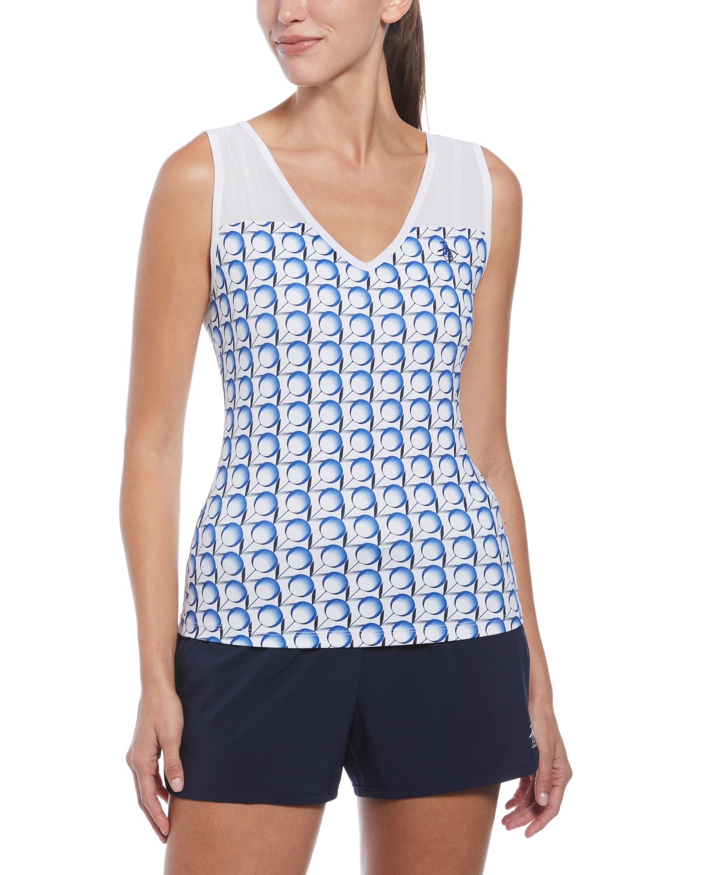 Get sporty style in this Original Penguin women's tank top. This women’s sleeveless shirt with mesh inserts boasts a tennis ball print that adds a touch of playfulness to your look. Designed with lightweight single knit fabrication, the tank offers excellent stretch for unrestricted movement, making it an ideal choice for both sports and leisure activities. Made from 44% recycled polyester sourced from plastic bottles, this tank top not only looks great but also contributes to a greener planet.