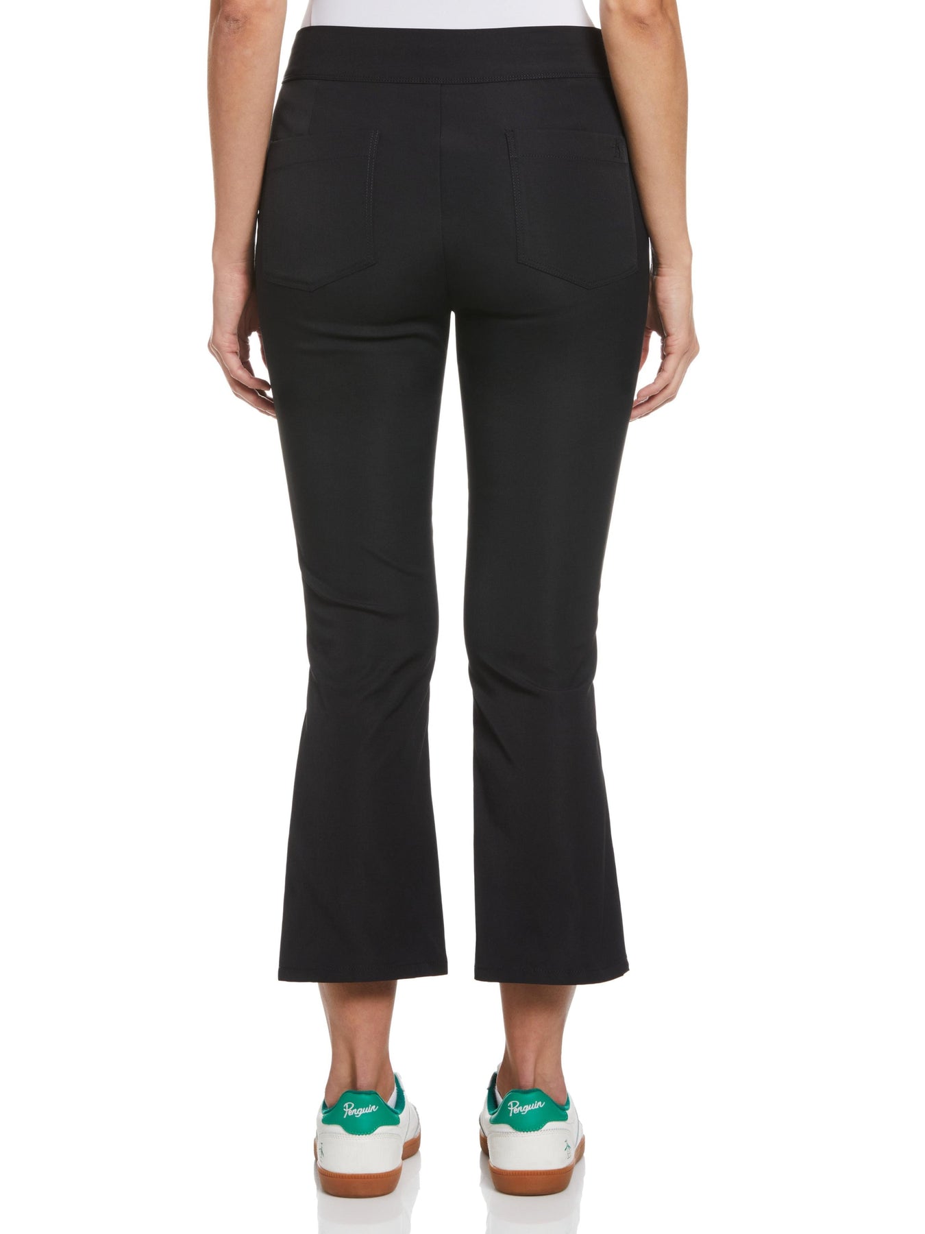These versatile Original Penguin women’s golf pants will look great with all of your course and clubhouse attire. A 5-pocket open front design with a flared crop leg delivers a stylish take on classic golf trousers. Easy care moisture-wicking stretch fabric ensures you feel as good as you look. The covered elastic waistband with anti-slip interior silicone gripper provides a superior fit that moves with you. These eco-friendly golf pants feature sustainable Elasterell with Sorona™ fabric.
